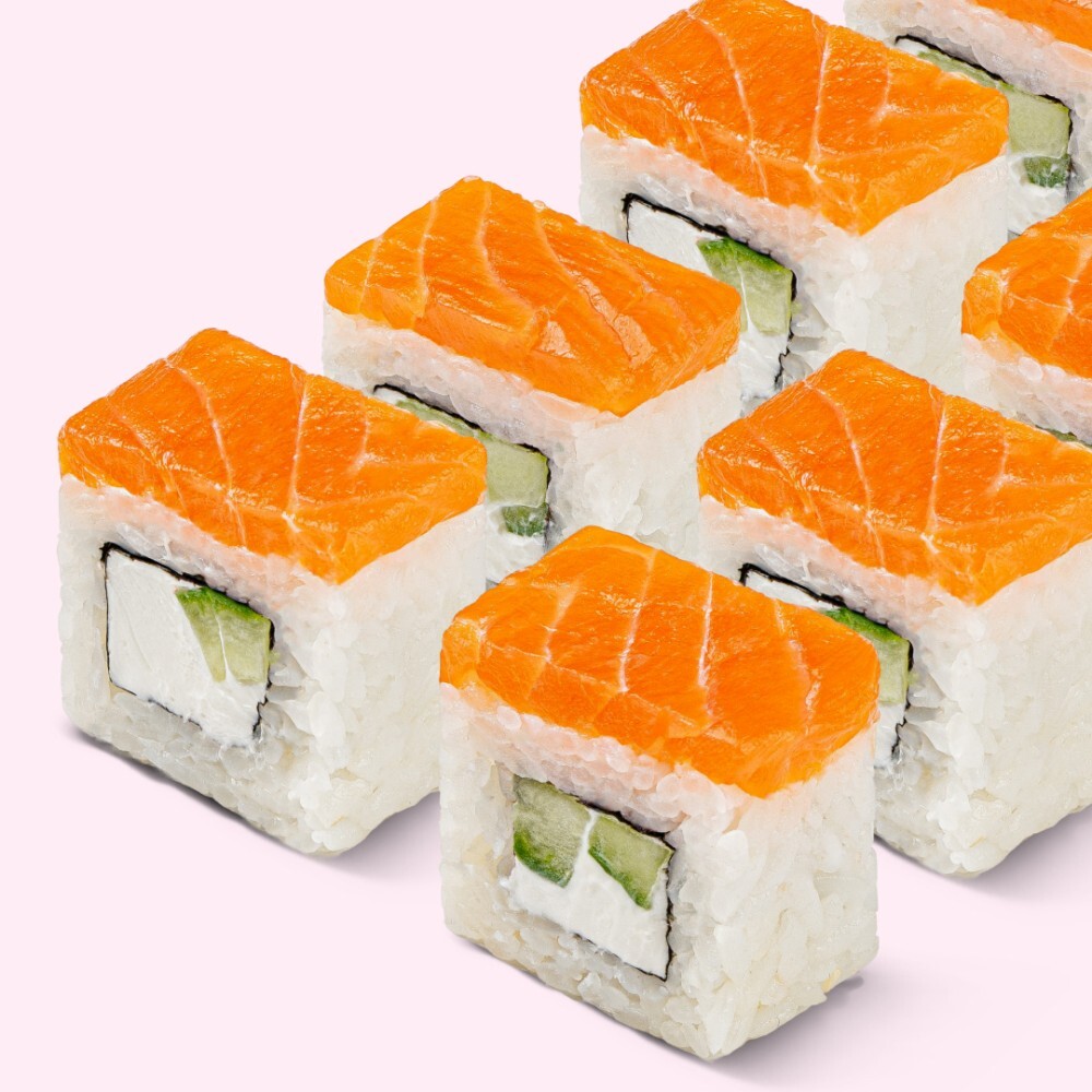 Рис, мицукан, сахар, комбу, соль, нори, огурец, лосось холодного копчения, сыр сливочный
